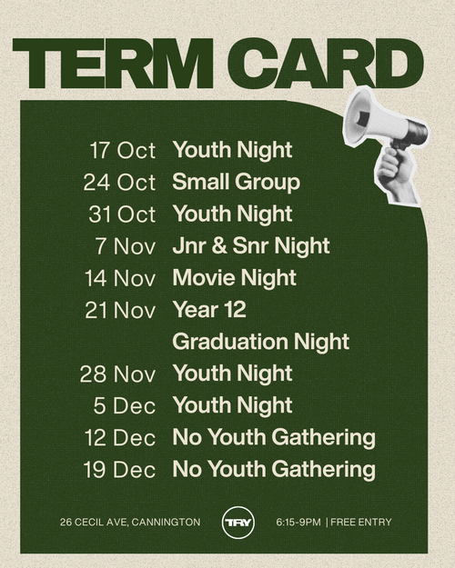 Youth Nights are the bread and butter of TRY. Across 5-6 nights each term, all year groups from Year 7 to 12, gather in the Main Auditorium for a night filled with light snacks, hangs, high-energy games, inspiring worship, and a hope-filled message.
